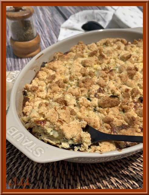 J’aime bien les crumbles en version salée, cela change et cela fait un plat bien complet. C’est chez ma chère Karen que j’ai pioché la recette, nous nous sommes régalés.