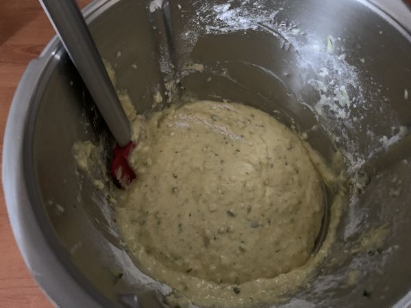 - Râper votre courgette, la mettre dans un saladier avec l’oignon, l’ail, bien mélanger. Ajouter les œufs, l’huile d’olive et mélanger, puis verser la farine, la levure, le parmesan et la mozzarella coupée en petits morceaux, assaisonner avec le sel, le poivre et les épices et les herbes, bien mélanger le tout.