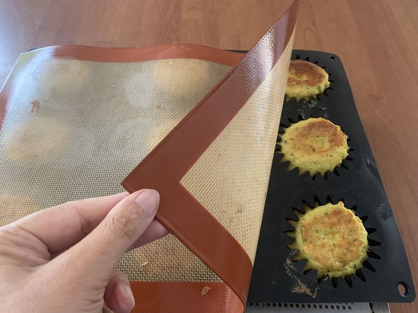 - Verser dans vos moules puis mettre au milieu une surprise pour chaque empreinte, en l’enfonçant dans la pâte. Recouvrir de toile silpat pour éviter que cela ne gonfle.
