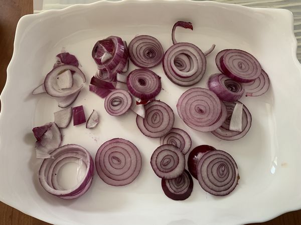 1. Préparer les légumes, éplucher les oignons rouges et les couper en fines rondelles. Laver, épépiner, et couper les poivrons en rondelles, laver et couper les tomates en rondelles.
