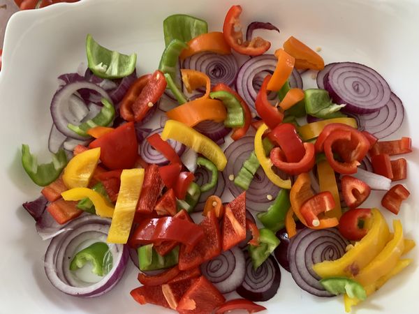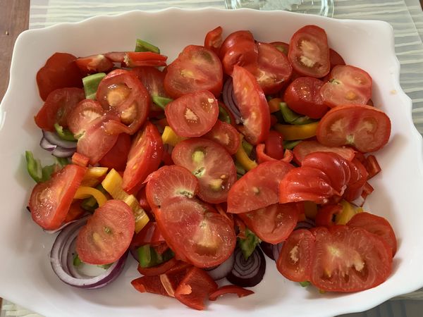 Voici un repas tout simple, la cuisson au four permet de vaquer à d’autres occupations et c’est parfait pour moi. Avec la baisse des températures, j’ai eu envie de nous faire un petit repas chaud, j’ai utilisé les premières tomates de mon jardin, et mes deux poivrons verts, j’ai complété les légumes en allant au marché. C’est un plat qui peut se faire en avance et vous pourrez le réchauffer au moment de servir.
