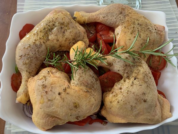 3. Déposer vos cuisses de poulet, verser un filet d’huile d’olive, saler, poivrer, verser l’eau puis déposer la branche de romarin.