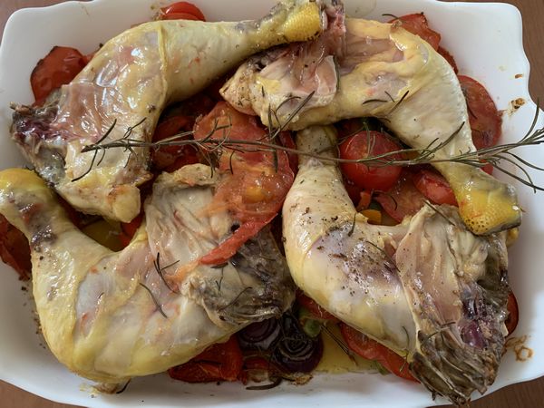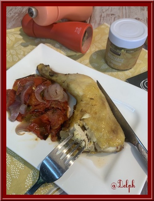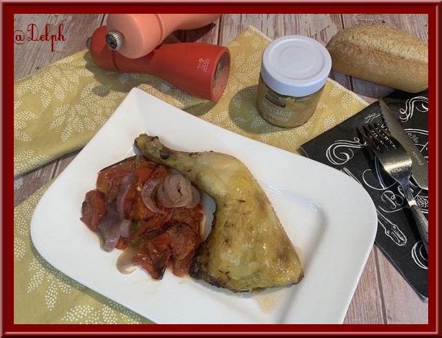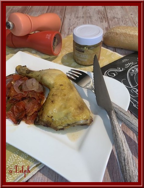 5. Enfourner pour 20 minutes, puis retourner les cuisses, continuer la cuisson environ 40 minutes, la cuisson est à surveiller, couvrir si cela dore trop.