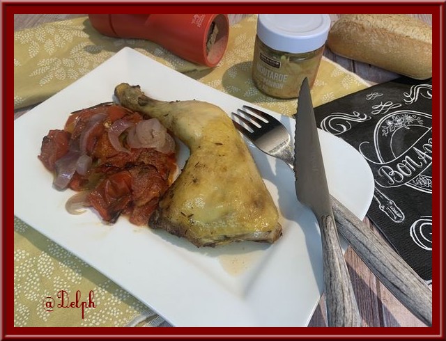 5. Enfourner pour 20 minutes, puis retourner les cuisses, continuer la cuisson environ 40 minutes, la cuisson est à surveiller, couvrir si cela dore trop.