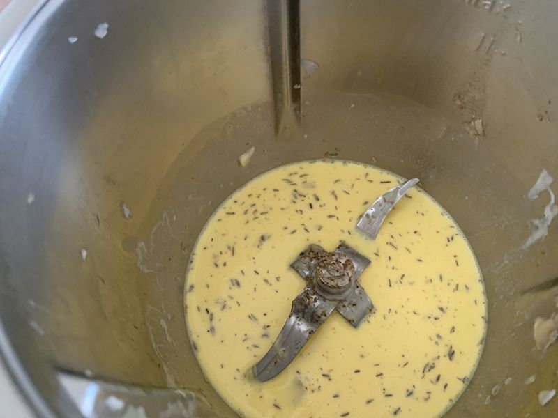 4. Dans le bol du Thermomix (inutile de le rincer) mettre les œufs, la crème du sel et du poivre puis mixer 40sec/vit3.