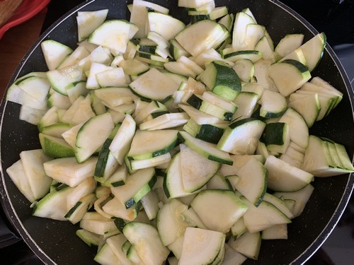 - Eplucher les courgettes, laissser une bande sur deux, les laver, les couper en rondelles puis en ‘.
