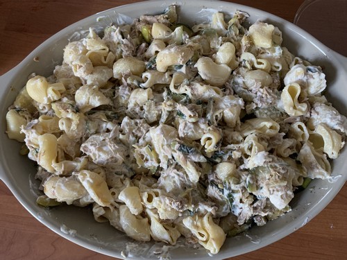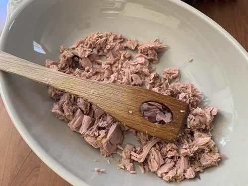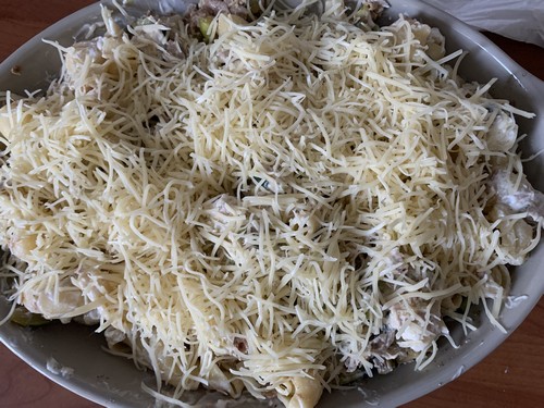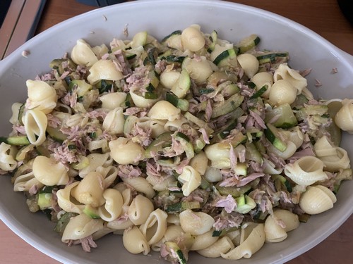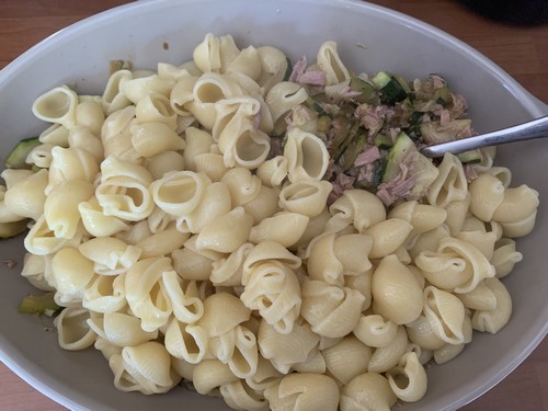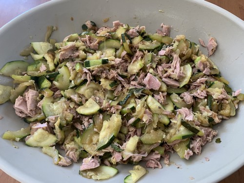 - Dans un plat à gratin, déposer le thon égoutté, les courgettes et les pâtes, mélanger le tout.