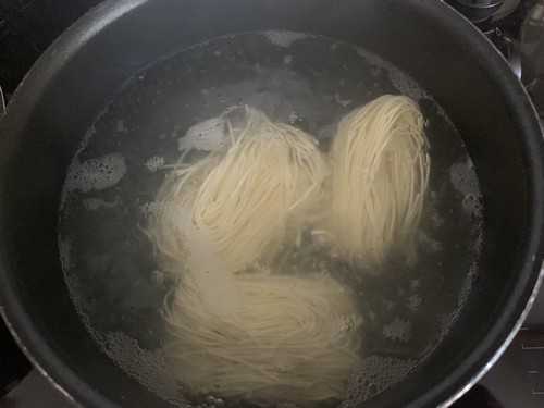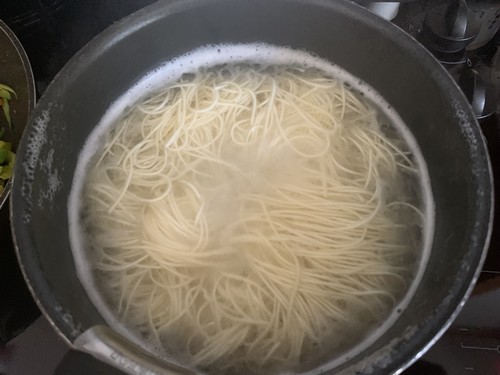 - En parallèle dans une grande casserole d’eau bouillante faire cuire les pâtes 3 minutes, les égoutter à l’eau froide, les remettre dans la casserole, ajouter les sauces, mélanger puis assaisonner à votre gout, faire sauter quelques minutes.