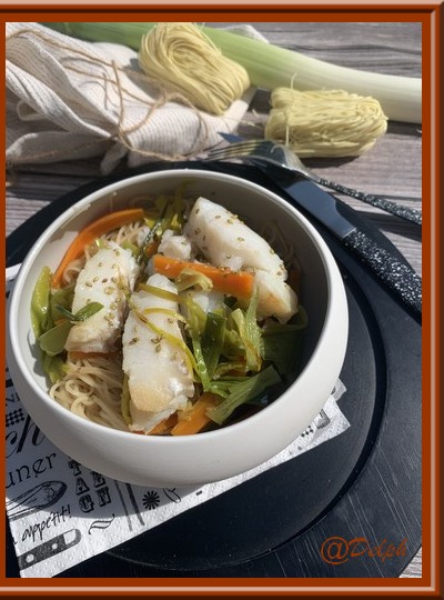 - Servir en déposant vos nouilles au fond des assiettes, couvrir de légumes puis placer quelques morceaux de cabillaud.