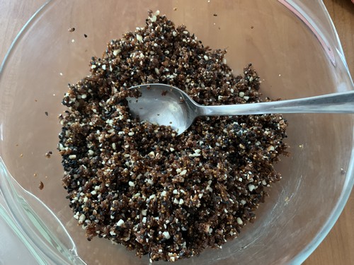 - Ajouter le sésame, mélanger à la spatule, verser dans un saladier.