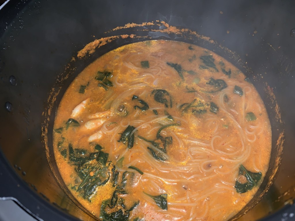 - Plonger les nouilles dans le bouillon et laisser dorer 3 minutes, puis plonger les crevettes et les pousses d’épinard et les oignons nouveaux ciselés.