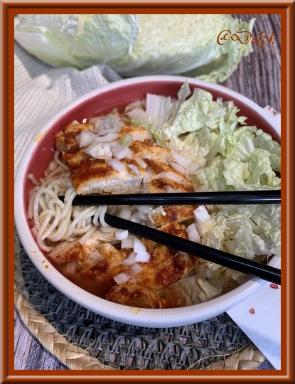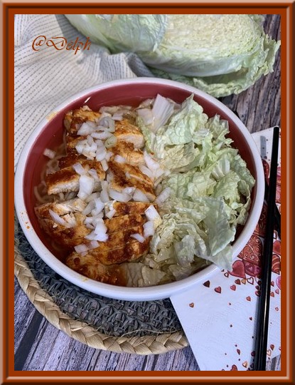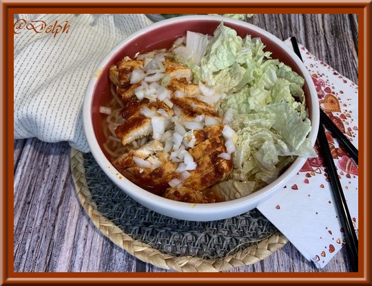Je suis dans ma période nouilles en ce moment, cela va faire la troisième recette que je vous propose avec ces délicieuses nouilles en peu de temps, vous avez eu droit au bouillon de crevettes, mais aussi des nouilles au bœuf et carotte, voici une version différente avec du poulet tout aussi savoureuse. J’espère ne pas vous lasser, en tout cas, chez nous tout le monde aime, alors j’en profite car c’est si simple et si bon.