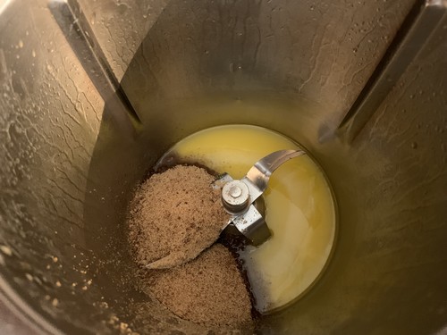 - Mettre le beurre coupé en petits morceaux dans le bol du Thermomix, puis faire fondre 3min/60°C/Vit1, ajouter le sucre et mélanger 1min/vit3.