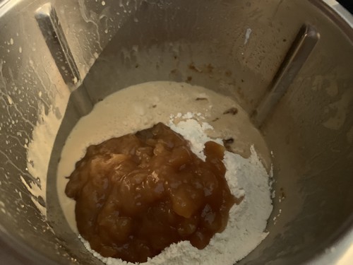 - Ajoute ensuite la compote et mélanger à la spatule sans trop travailler la pâte.