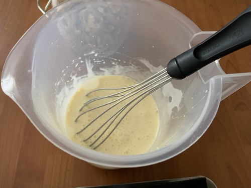 - Dans un saladier, fouetter les œufs, y ajouter la crème du sel et du poivre, mélanger le tout.