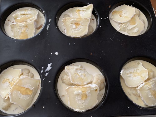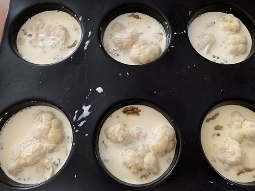 J’aime bien ce genre de clafoutis, je vous en propose déjà de multiples versions sur le blog, on peut varier les ingrédients selon les saisons et nos gouts. Cela fait des petites entrées très faciles à réaliser. Ici cela m’a permis d’utiliser des fleurs de chou-fleur qu’il me restait d’une autre recette.