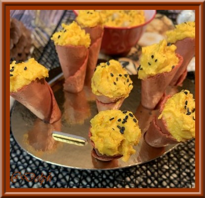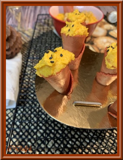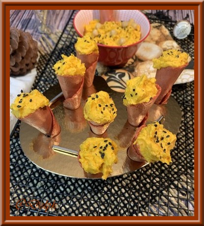 Voici ma dernière recette avec les potimarrons de mon potager, c’est un houmous pour nos apéros, nous aimons beaucoup ce genre de tartinade, on peut en réaliser à tous les goûts. J’ai présenté mon houmous dans des mini-cônes de prêt à garnir pour que cela soit plus festif.