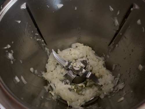 1. Mettre l’oignon épluché et coupé en deux dans le bol du Thermomix avec les gousses d’ail épluchées et dégermées, mixer 5sec/vit5, verser l’huile et faire chauffer 3min/Varoma/vit1