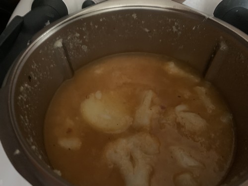 2. Ajouter la pâte de curry et faire chauffer 2min/100°C/vit1, ajouter le chou-fleur nettoyé et coupé en fleurette avec les pommes de terre épluchées et coupées en morceaux, le concentré de tomates, l’eau le sel et le poivre puis faire chauffer 19 min/varoma/vit1.