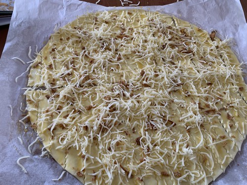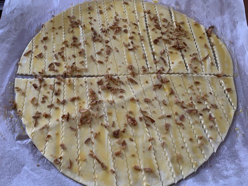 - Badigeonner avec le jaune d’œuf, parsemer de fromage puis d’oignons frits que vous aurez réduits en poudre.