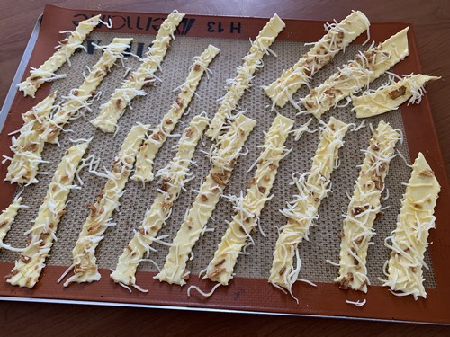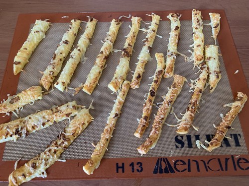 - Déposer les bandes de pâtes sur une plaque de four recouverte de papier sulfurisé.