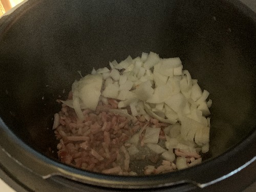 - Mettre votre Cookéo en mode dorer, puis y déposer vos lardons fumés, mélanger laisser dorer 1 minute, ajouter l’oignon ciselé et laisser dorer 2 minutes, mélanger.