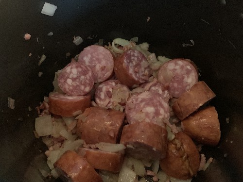 - Ajouter les saucisses coupées en rondelles d’environ 1 cm, puis mélanger, laisser dorer 3 minutes.