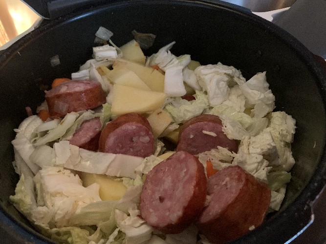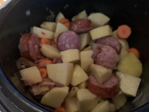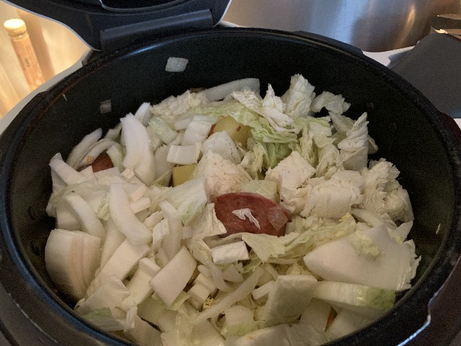 - Incorporer les pommes de terres, les carottes, mélanger et laisser dorer 5 minutes. Ajouter le chou, mélanger, laisser à nouveau 2 minutes en mode dorer.