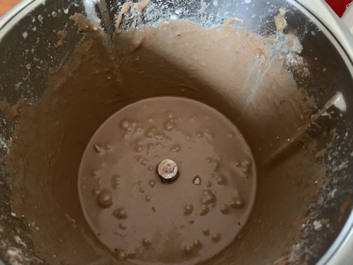 - Mettre les œufs, le lait et le beurre fondu dans le bol du Thermomix puis mixer 30 sec/vit 4, ajouter la farine, le sucre, le sel, la levure et le cacao puis mixer à nouveau 30 sec/vit4.