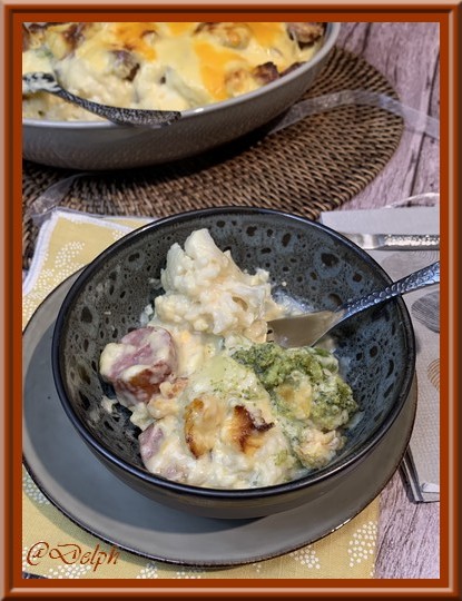 Gratin aux deux choux et saucisses de Montbéliard