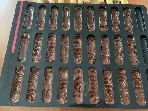 - Démouler et mettre environ 7 g de chocolat dans les empreintes.