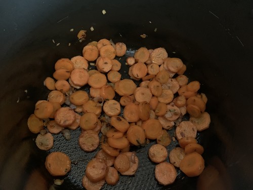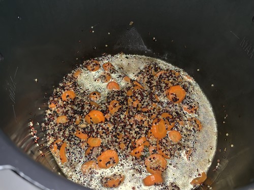 - Verser l’huile dans la cuve du Cookéo et faire revenir l’échalote émincée, les graines de cumin, et le cumin en poudre puis les carottes pendant 3 minutes en mode dorer. Ajouter le quinoa, et le bouillon.