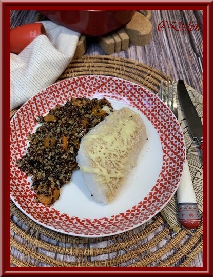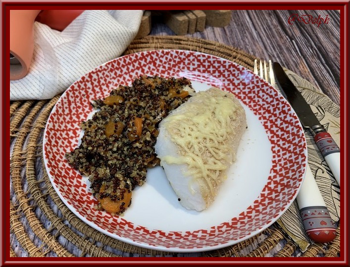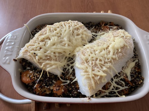 - Dans un plat à gratin, déposer le quinoa et les carottes, mettre par dessus le cabillaud avec un peu de chapelure et gruyère.