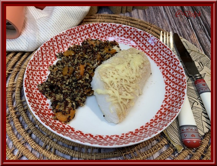- Dans un plat à gratin, déposer le quinoa et les carottes, mettre par dessus le cabillaud avec un peu de chapelure et gruyère.