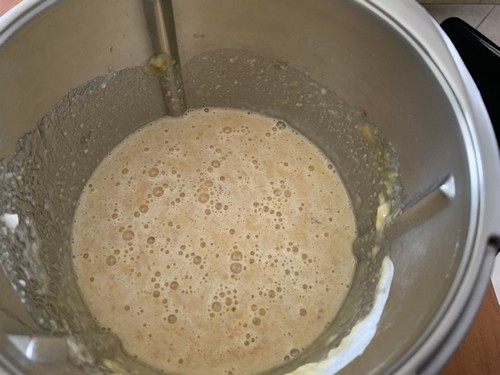 - Dans le bol du Thermomix, mettre les oranges cuites coupées en 4, la poudre d’amande, les œufs, 150 grammes de sucre et la levure. Mixer 20 sec/ vit 4.