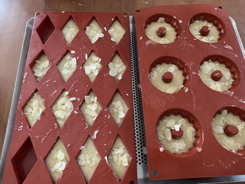 3. Verser la préparation dans des moules à financiers beurrés et farinés et recouvrir chaque financiers de quelques amandes effilées.