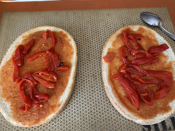 - Mettre vos bruschetta dans votre grille pain, puis étaler une fine couche de sauce tomate, déposer les lanières de poivrons marinés.