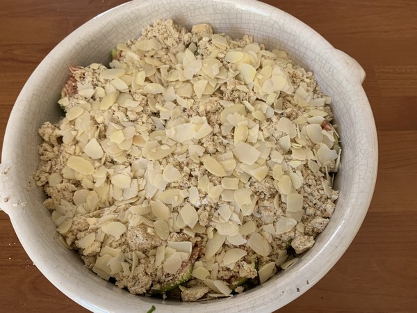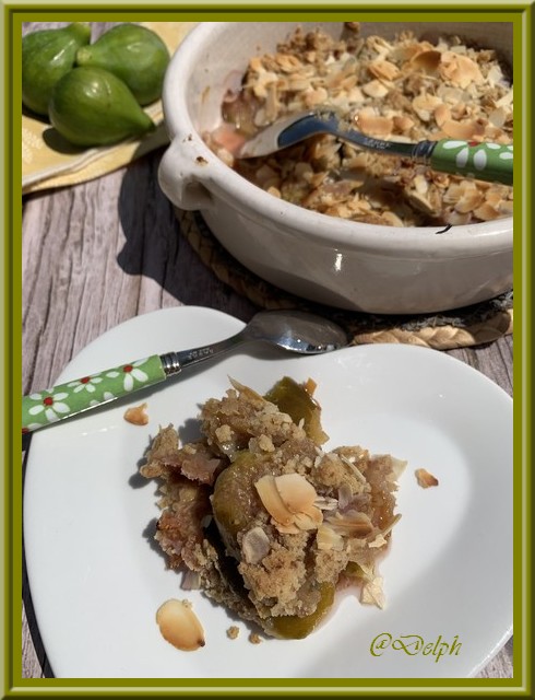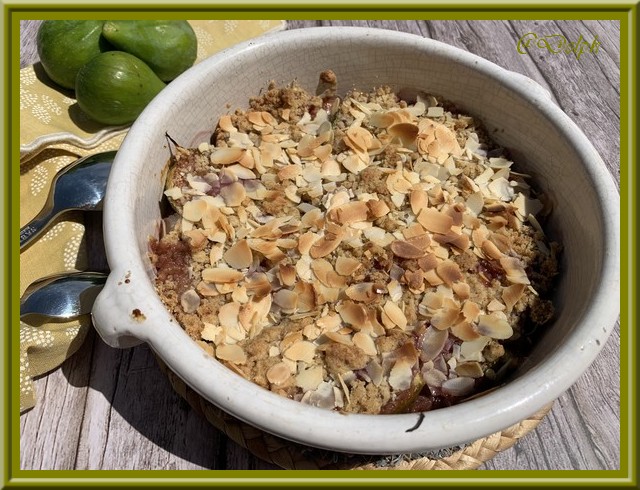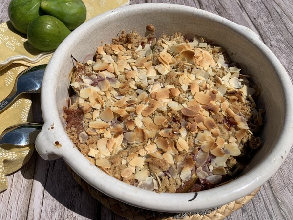 - Répartir ce crumble sur les figues, parsemer d’amande effilées.