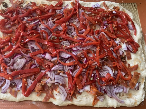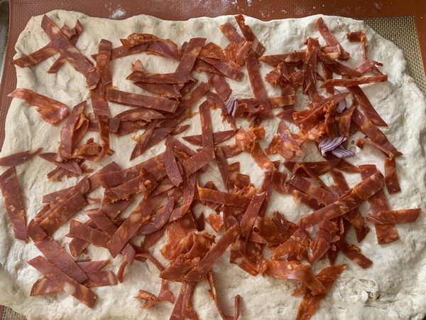5. Répartir, les lanières de chorizo, de poivron et les oignons rouges sur la surface de la pâte, saupoudrer d’herbes à pizza.