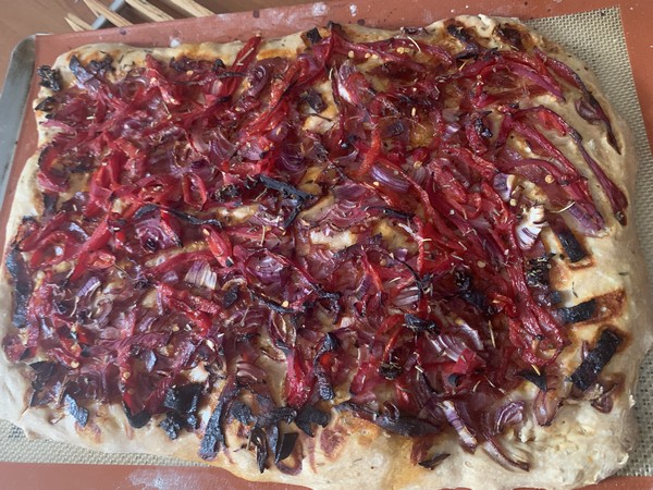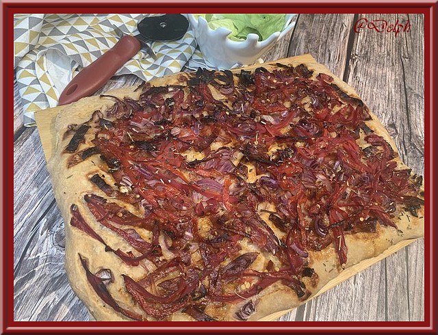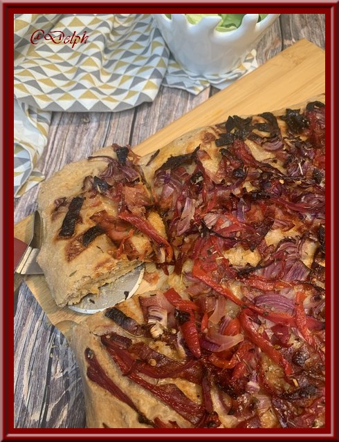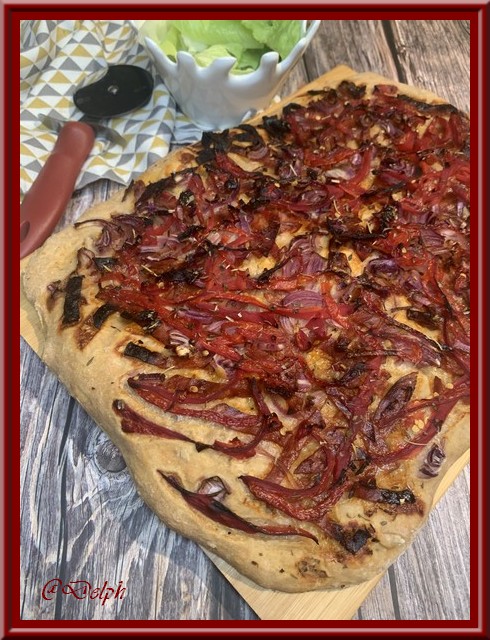 Après la réalisation de ma focaccia aux oignons rouges, j’ai eu envie de réitérer en mettant d’autres ingrédients sur le dessus. Celle-ci je l’ai présentée en entrée avec une bonne salade verte du potager.