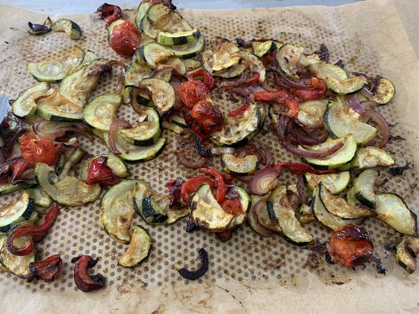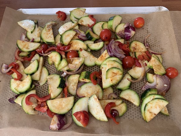 - Disposer sur un papier sulfurisé les légumes, puis enfourner pour 30 minutes, remuer à mi cuisson.