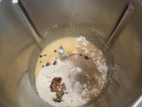 5. Incorporer la farine, la levure, le sucre vanillé et l’arome vanille puis mélanger 30sec/vit4.