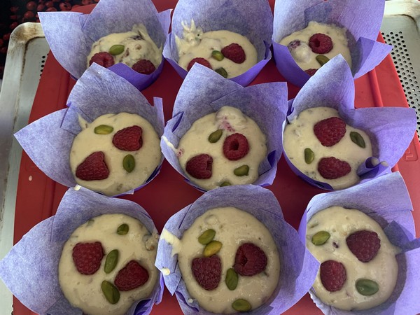 - 50 g d’éclats de pistache + 18 pour le dessus des muffins