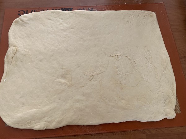 - Une fois la pâte levée, fariner le plan de travail et étaler la pâte en un grand rectangle.