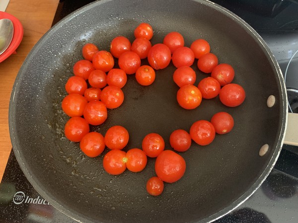 - Equeuter les tomates cerises puis les faire revenir 3 minutes à la poêle avec l’huile, en secouant la poêle. Réserver.