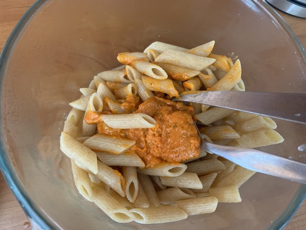 - A la fin de cuisson, égoutter puis ajouter le pesto rosso, bien mélanger le tout. Assaisonner avec du sel et du poivre à votre goût.