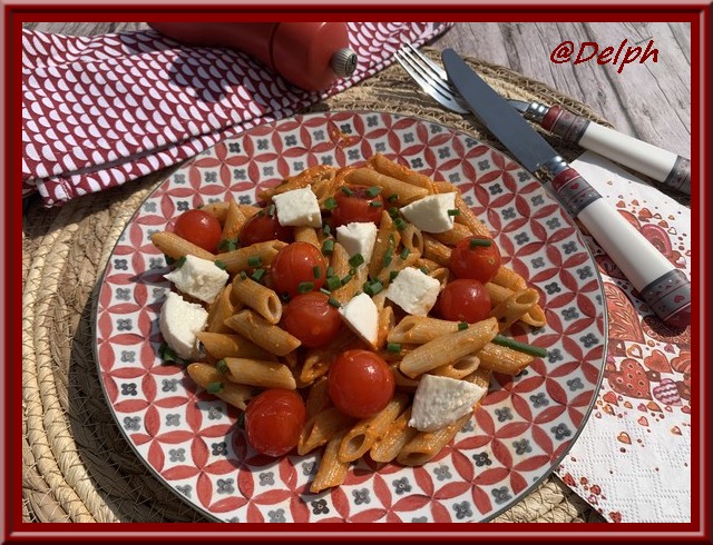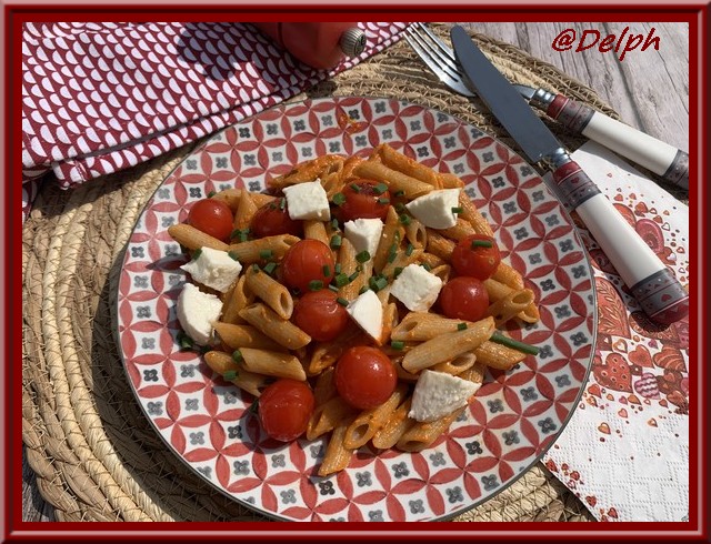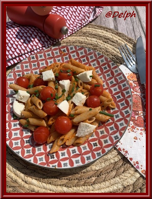 - Dresser vos pâtes dans les assiettes, disposer vos tomates cerises, puis ciseler un peu de ciboulette et mettre des petits dés de mozzarella.