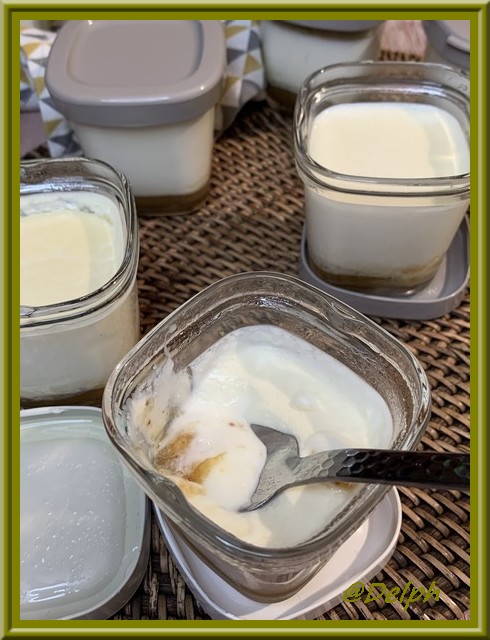 - Placer les pots sans les fermer dans la yaourtière, placer les couvercles sur les trous vides, et passer en mode yaourt pour 7 heures.