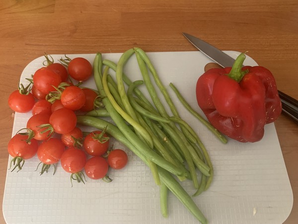 J’ai récolté dans mon potager les dernières tomates cerise, poivron et haricots verts. Une petite récolte que j’ai souhaité associé au quinoa pour me faire un plat tout simple mais bien bon. Cela pourra accompagné un poisson ou une volaille.