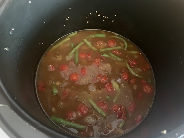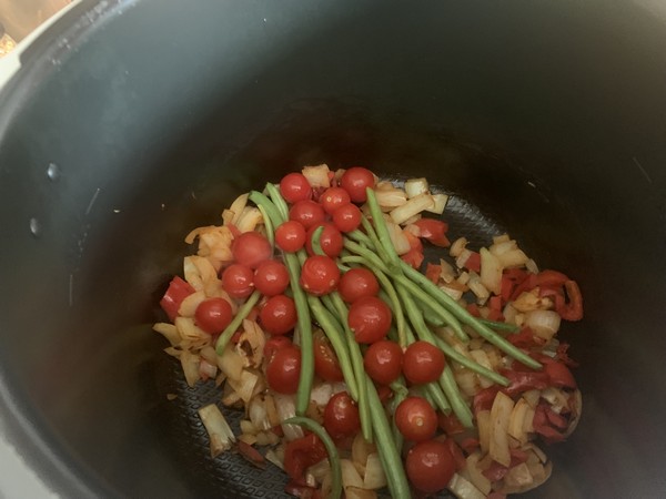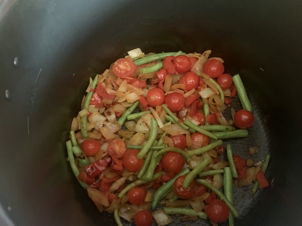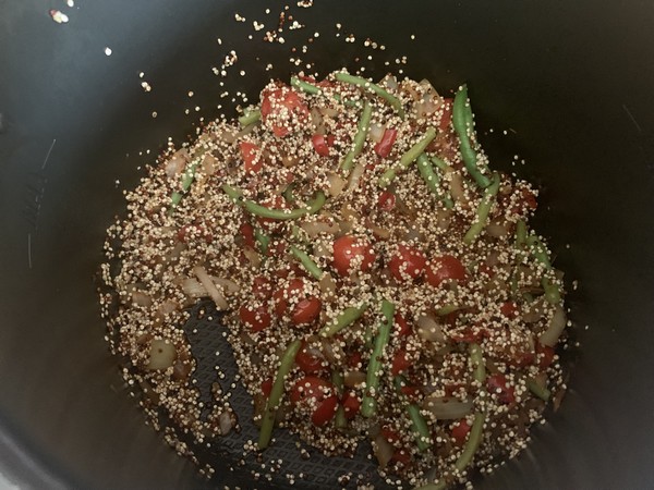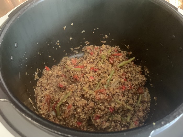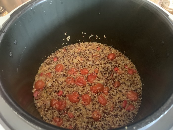 - Incorporer les haricots, les tomates cerise lavées, le quinoa, mélanger à la spatule, verser le bouillon, assaisonner à votre goût puis lancer le mode sous pression pour 9 minutes.